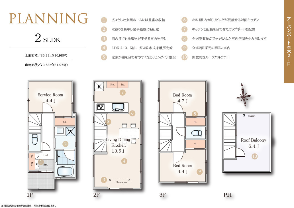 アーバンポートでは多数のバルコニーを設置。毎日の家事が少しでもラクになる家事動線を意識したバルコニー配置となっています。また開放的なルーフバルコニーも。電源・水栓・照明が付いていますのでガーデニングや夏はプール等用途多彩。晴れた日は広々とした屋上がもうひとつのリビングスペースへと変化します。
