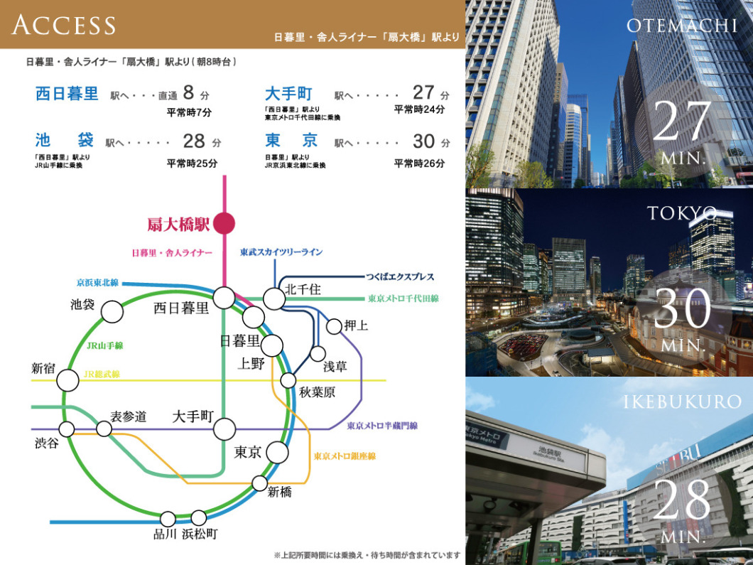 扇大橋駅より日暮里・舎人ライナー利用で通勤時でも都心へ30分以内のアクセスが可能。毎日の通勤、通学にもアクセス良好!