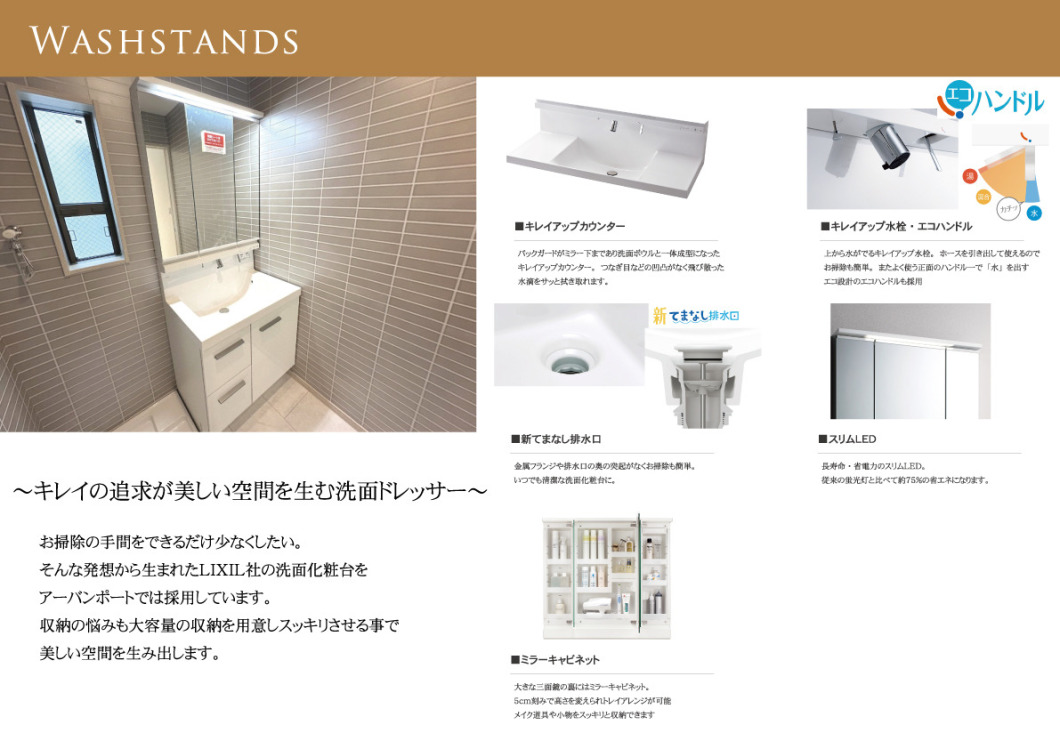 お掃除の手間をできるだけ少なくしたい。そんな発想から生まれたLIXIL社の洗面化粧台をアーバンポートでは採用しています。収納の悩みも大容量の収納を用意しスッキリさせる事で美しい空間を生み出します。