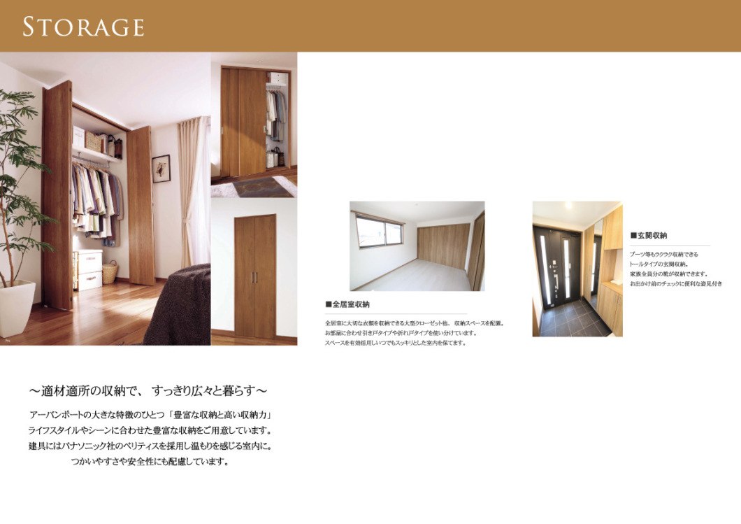 アーバンポートの大きな特徴のひとつ「豊富な収納と高い収納力」ライフスタイルやシーンに合わせた豊富な収納をご用意しています。建具にはパナソニック社のベリティスを採用し温もりを感じる室内に。つかいやすさや安全性にも配慮しています。