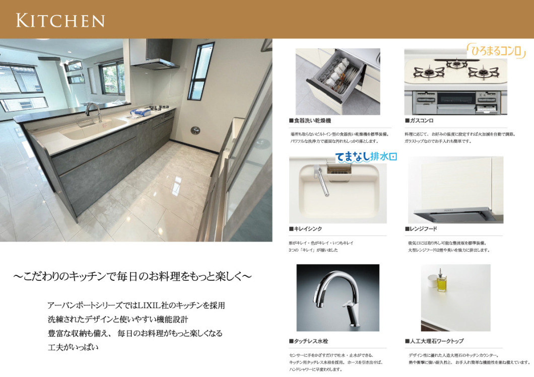 アーバンポートシリーズではLIXIL社のキッチンを採用。洗練されたデザインと使いやすい機能設計。豊富な収納も備え、毎日のお料理がもっと楽しくなる工夫がいっぱい。