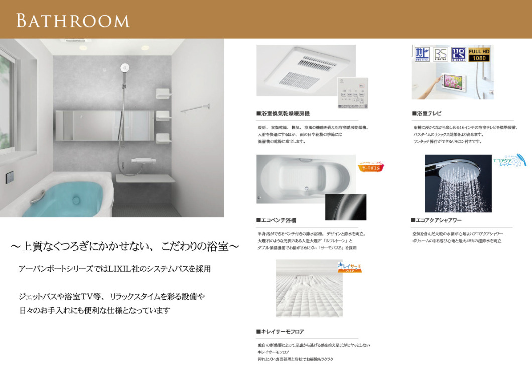 アーバンポートシリーズではLIXIL社のシステムバスを採用。1坪タイプのゆったり設計。ジェットバスや浴室TV等、リラックスタイムを彩る設備や日々のお手入れにも便利な仕様となっています。