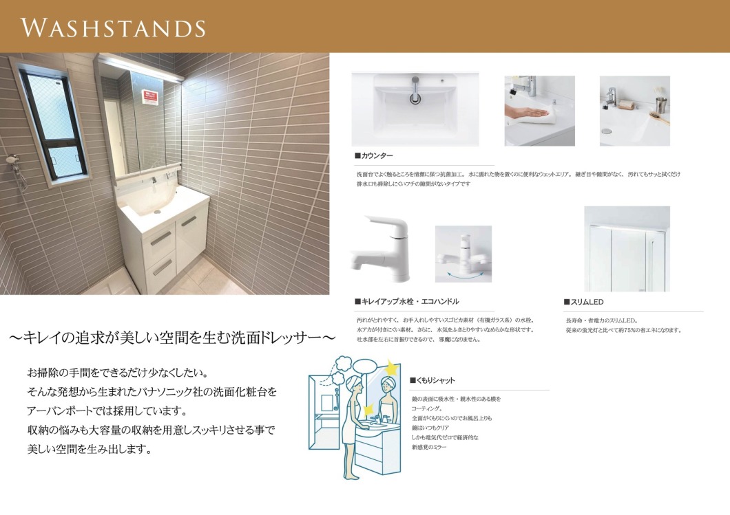 お掃除の手間をできるだけ少なくしたい。そんな発想から生まれたパナソニック社の洗面化粧台をアーバンポートでは採用しています。収納の悩みも大容量の収納を用意しスッキリさせる事で美しい空間を生み出します。