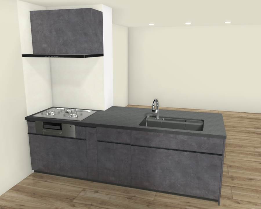 【完成イメージ】お手入れのしやすい人工大理石トップのシステムキッチン。収納スペースも豊富。3口コンロでお料理の幅も広がりますね。