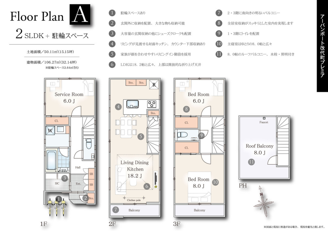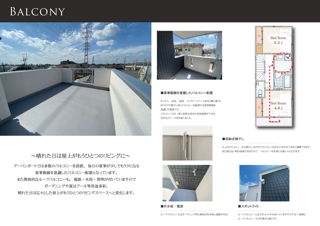 アーバンポートでは多数のバルコニーを設置。毎日の家事が少しでもラクになる家事動線を意識したバルコニー配置となっています。また開放的なルーフバルコニーも。電源・水栓・照明が付いていますのでガーデニングや夏はプール等用途多彩。晴れた日は広々とした屋上がもうひとつのリビングスペースへと変化します。