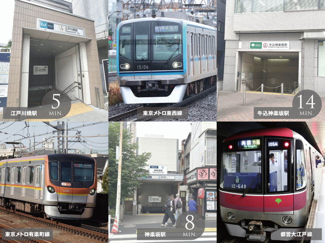 東京メトロ東西線「神楽坂」駅へも徒歩8分、都営大江戸線「牛込神楽坂」駅へも徒歩14分、都心の南北、東西の縦断と環状が叶い、至高のアクセス