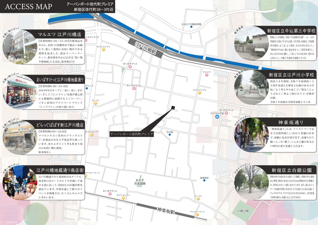 | 交通 | 東京メトロ有楽町線「江戸川橋」駅徒歩4分 東京メトロ東西線「神楽坂」駅徒歩7分 都営大江戸線「牛込神楽坂」駅徒歩14分 |