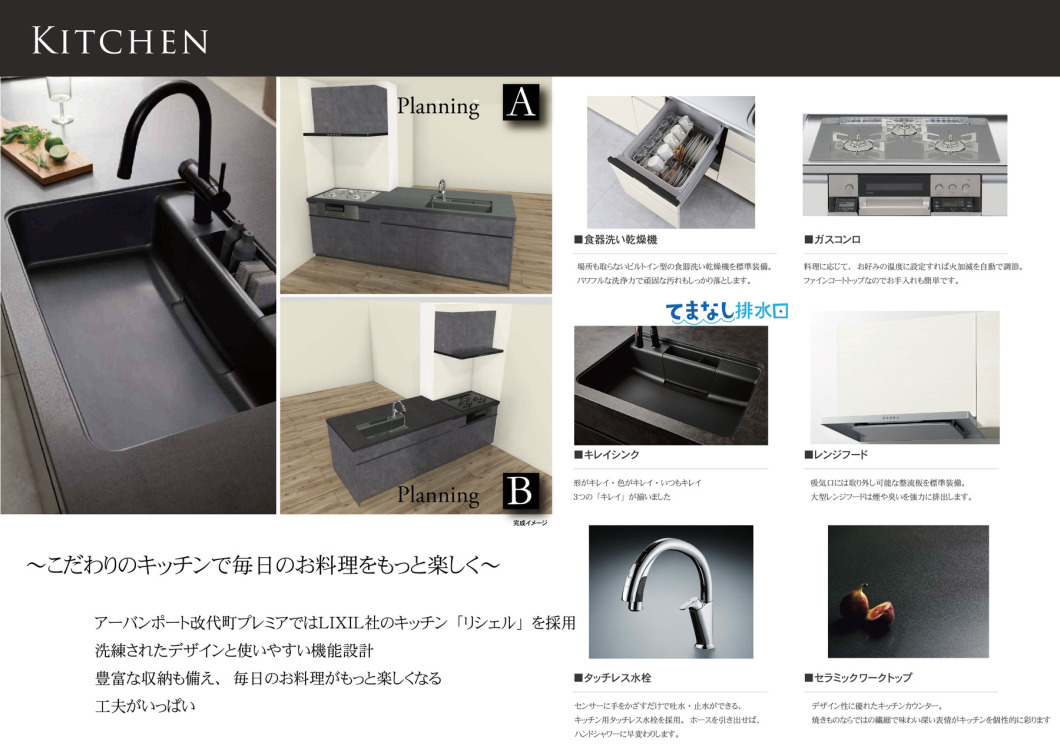 アーバンポート改代町プレミアムではLIXIL社のキッチン「リシェル」を採用。洗練されたデザインと使いやすい機能設計。豊富な収納も備え、毎日のお料理がもっと楽しくなる工夫がいっぱい。