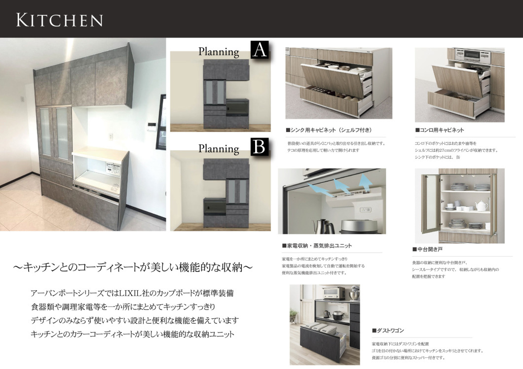 アーバンポートシリーズではLIXIL社のカップボードが標準装備。食器類や調理家電等を一か所にまとめてキッチンすっきり。デザインのみならず使いやすい設計と便利な機能を備えています。キッチンとのカラーコーディネートが美しい機能的な収納ユニット