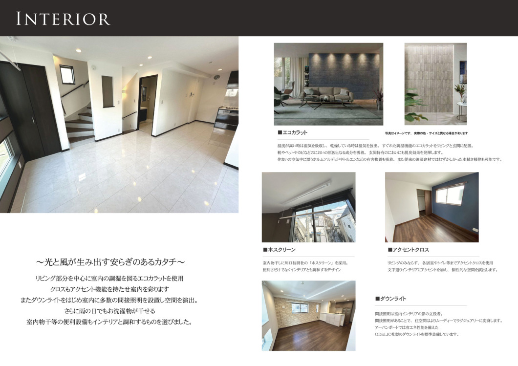 リビング部分を中心に室内の調湿を図るエコカラットを使用。クロスもアクセント機能を持たせ室内を彩ります