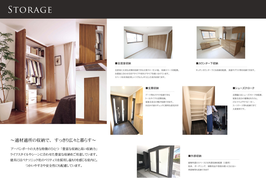 アーバンポートの大きな特徴のひとつ「豊富な収納と高い収納力」ライフスタイルやシーンに合わせた豊富な収納をご用意しています。建具にはパナソニック社のベリティスを採用し温もりを感じる室内に。つかいやすさや安全性にも配慮しています。