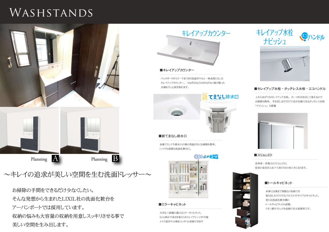 お掃除の手間をできるだけ少なくしたい。そんな発想から生まれたLIXIL社の洗面化粧台をアーバンポートでは採用しています。収納の悩みも大容量の収納を用意しスッキリさせる事で美しい空間を生み出します。