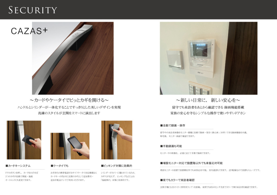 カードをかざすだけで施解錠ができ、一度の操作で2ロックが可能なカードキー採用の玄関ドア。シンプルな操作でお子さまも使いやすく、録画機能もあるカラーモニターインターフォン。