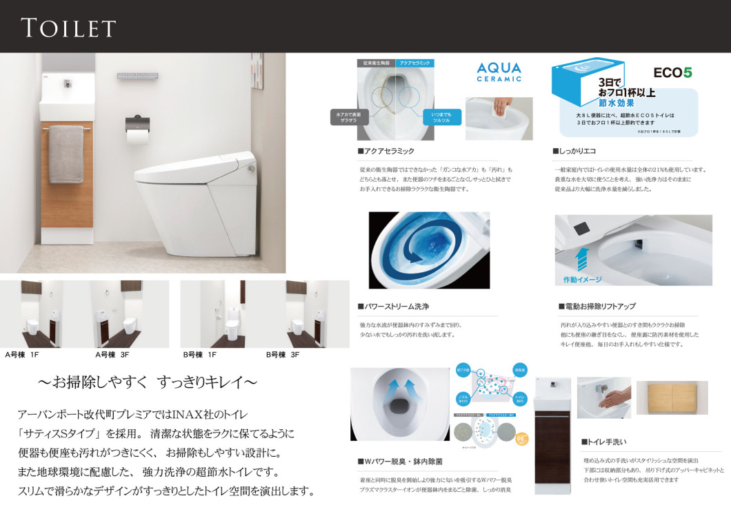 アーバンポート改代町プレミアではINAX社のトイレ「サティスSタイプ」を採用。清潔な状態をラクに保てるように便器も便座も汚れがつきにくく、お掃除もしやすい設計に。また地球環境に配慮した、強力洗浄の超節水トイレです。スリムで滑らかなデザインがすっきりとしたトイレ空間を演出します。