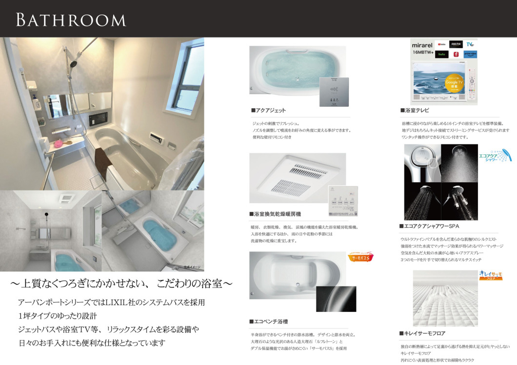 アーバンポートシリーズではLIXIL社のシステムバスを採用。1坪タイプのゆったり設計。ジェットバスや浴室TV等、リラックスタイムを彩る設備や日々のお手入れにも便利な仕様となっています。