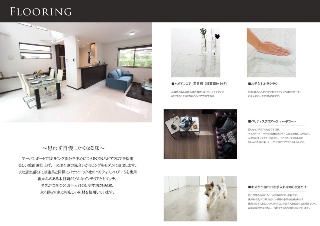 アーバンポートではリビング部分を中心にDAIKENハピアフロアを採用。美しい鏡面調仕上げ、大理石調の風合いがリビングをモダンに演出します。また居室部分には建具と同様にパナソニック社のベリティスフロアーSを使用温かみのある木目調がどんなインテリアともマッチ。キズがつきにくくお手入れのしやすさにも配慮。永く暮らす家に相応しい床材を使用しています。