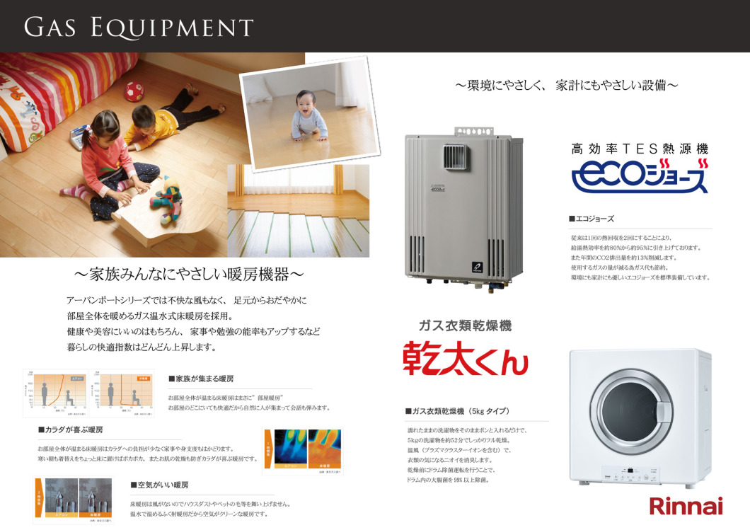 アーバンポートシリーズでは不快な風もなく、足元からおだやかに部屋全体を暖めるガス温水式床暖房を採用。健康や美容にいいのはもちろん、家事や勉強の能率もアップするなど暮らしの快適指数はどんどん上昇します。また熱回収を従来の倍にすることにより給湯効率を15%アップ。またCO2排出量も削減します。仕様ガス量が減りガス代も節約。環境にも家計にも優しいエコジョーズを標準装備。