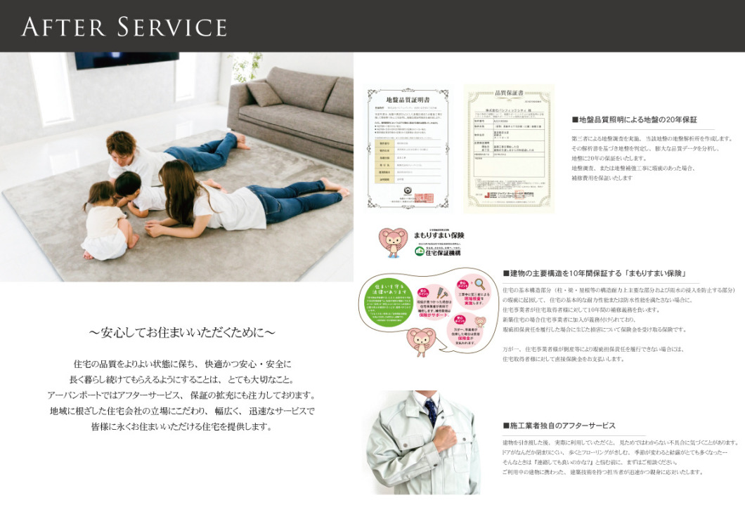 住宅の品質をよりよい状態に保ち、快適かつ安心・安全に長く暮らし続けてもらえるようにすることは、とても大切なこと。アーバンポートではアフターサービス、保証の拡充にも注力しております。地域に根ざした住宅会社の立場にこだわり、幅広く、迅速なサービスで皆様に永くお住まいいただける住宅を提供します。