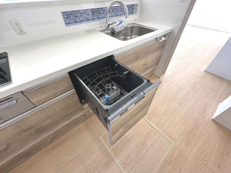 忙しい毎日の家事をサポートしてくれる食洗器付きシステムキッチン。食器をセットしたら、ボタンひとつで全自動。時間の節約にもなりますし、手洗いよりも衛生的で、汚れもスッキリ落としてくれます。 【2号棟】