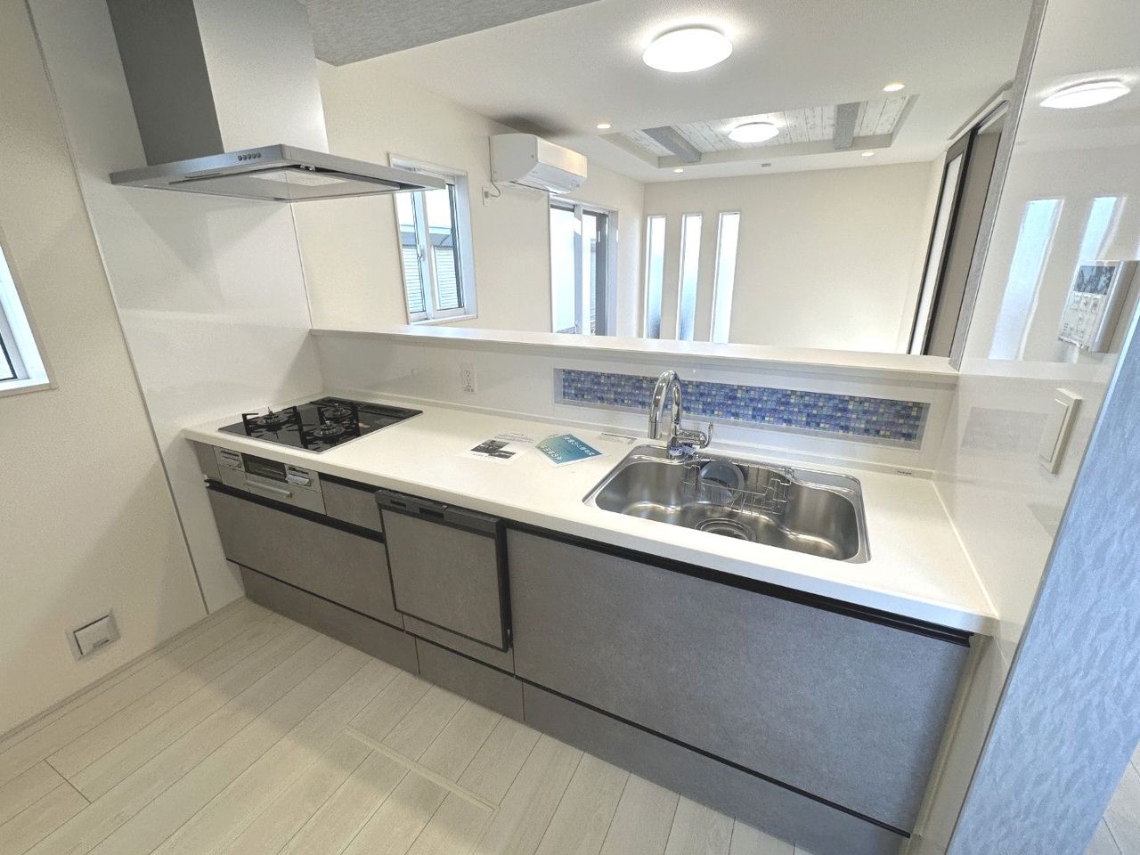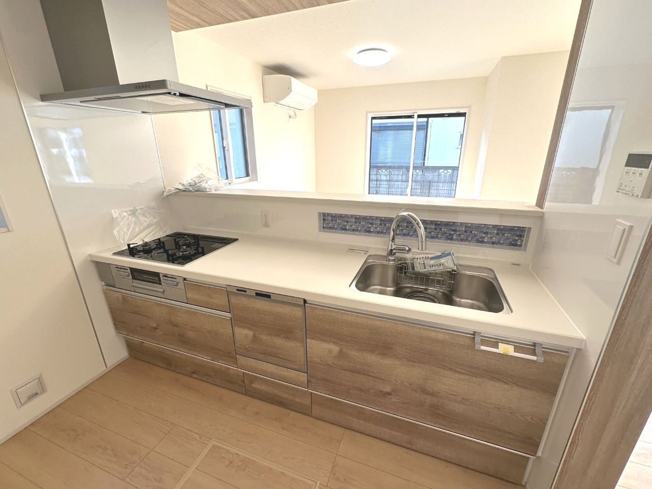 リビングが見渡せる人気の対面キッチンを採用。お料理しながら家族の会話も弾みます。目が届きますので小さなお子様がいるご家庭でも安心。【2号棟】