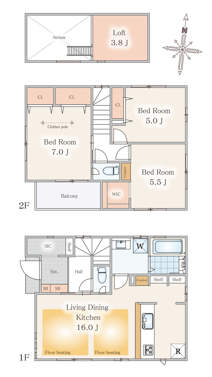 - 全棟LDK16帖以上、ゆとりの2階建て3LDK、ロフト・車庫付き全3棟。LDK床暖房、食洗器他設備充実。