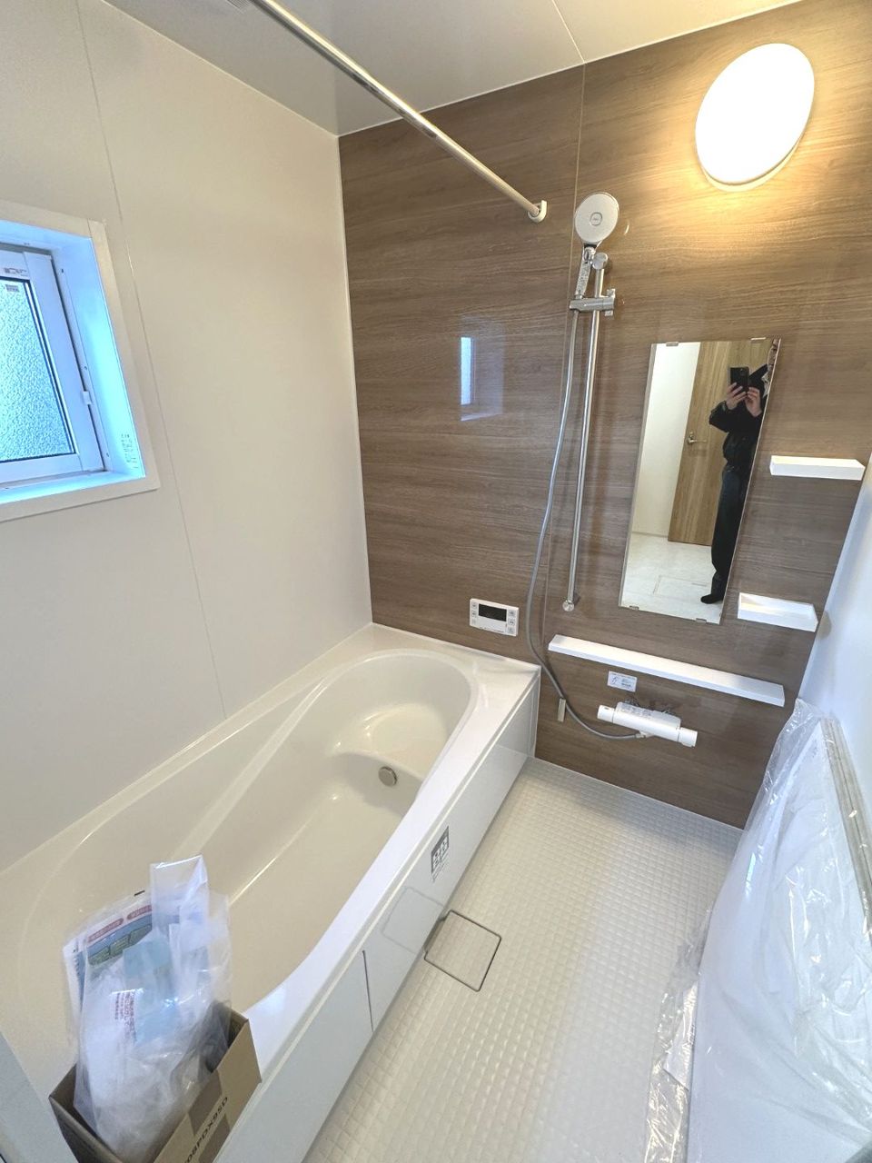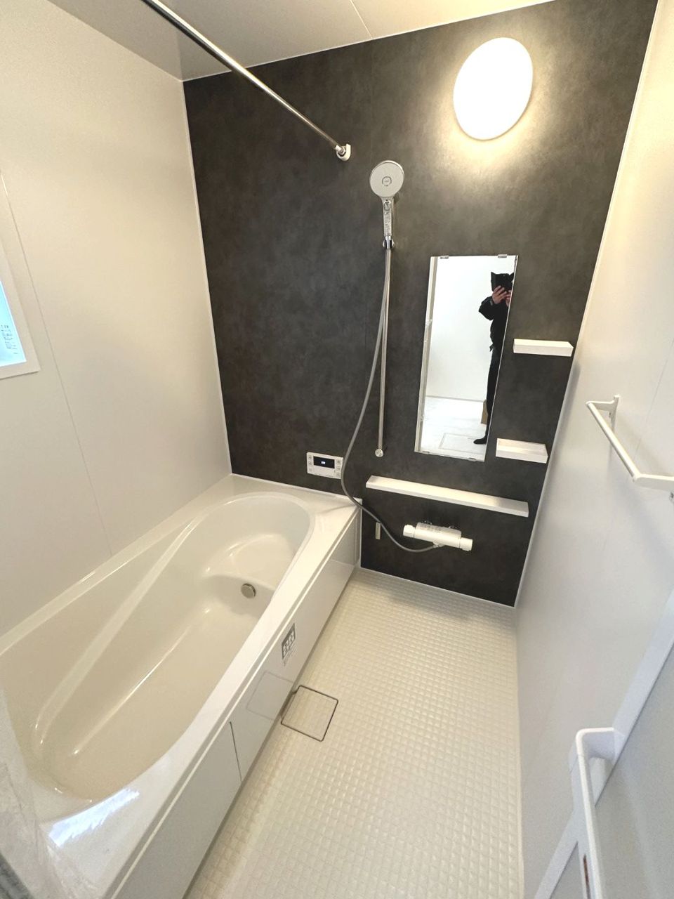 一日の疲れを癒す1坪タイプの浴室。足を伸ばしてゆったりと入れる浴槽。床、カウンター、排水溝などお掃除が大変な場所は、汚れがつきにくく、お手入れしやすい設計。【2号棟】