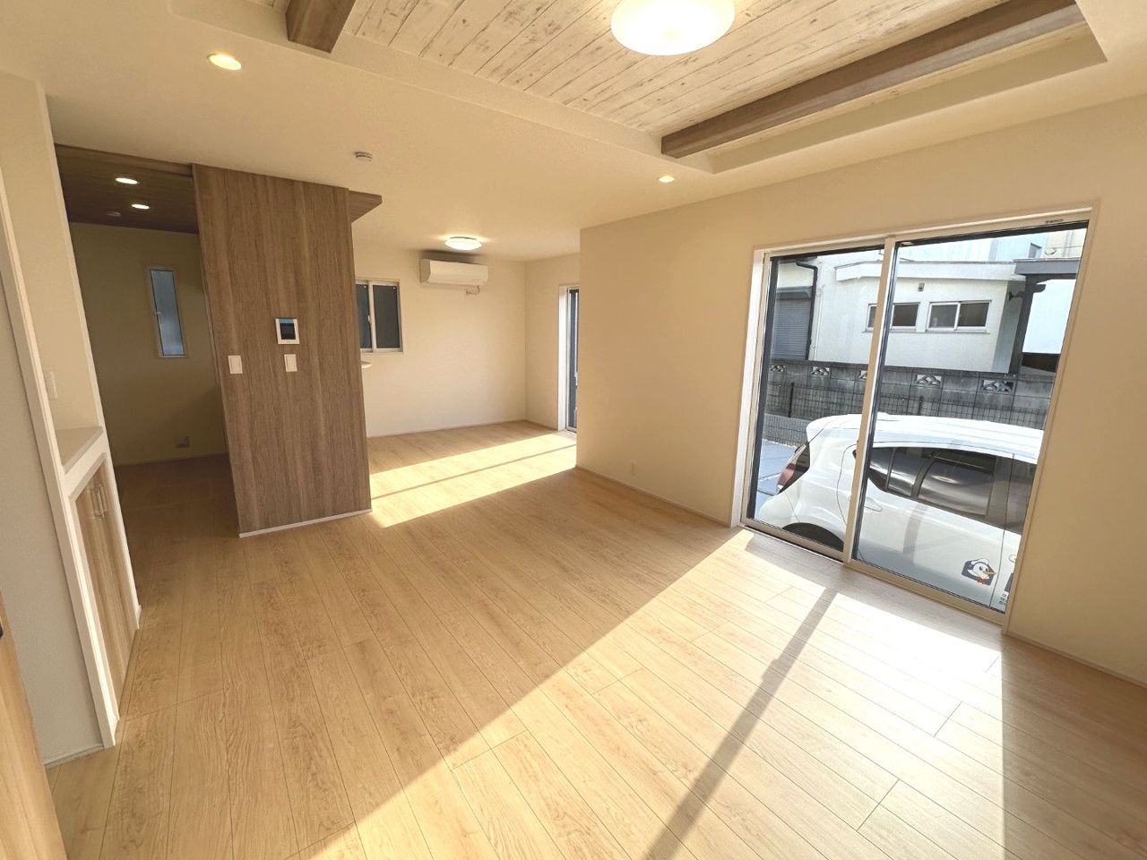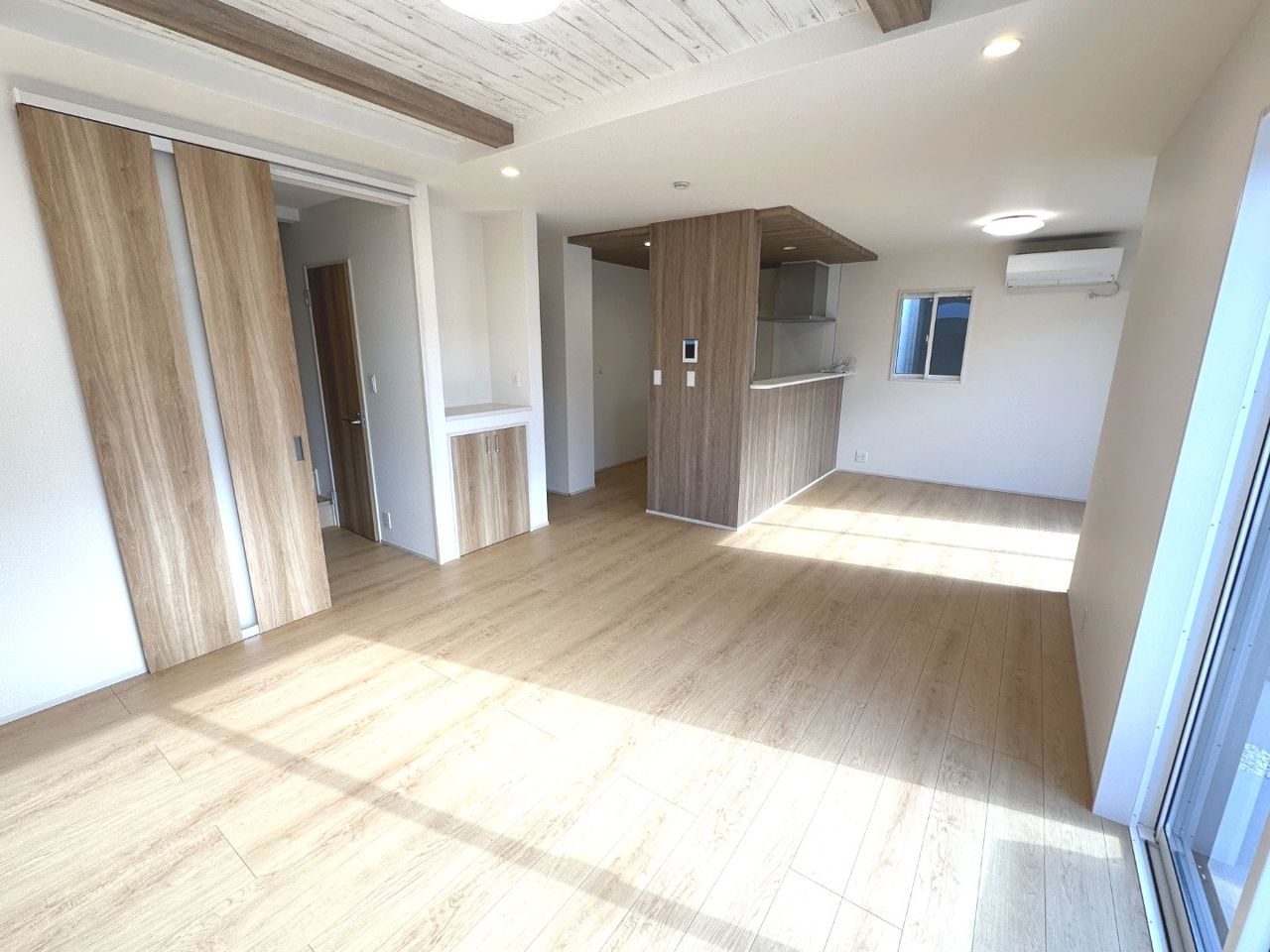ゆったりとした時間が流れるくつろぎのLDK。ご家族との会話を中心に考えた一体感のある間取りになっています。陽光をしっかり取り入れた、明るく広々としたリビング空間は家族団欒の場に最適です。【1号棟】