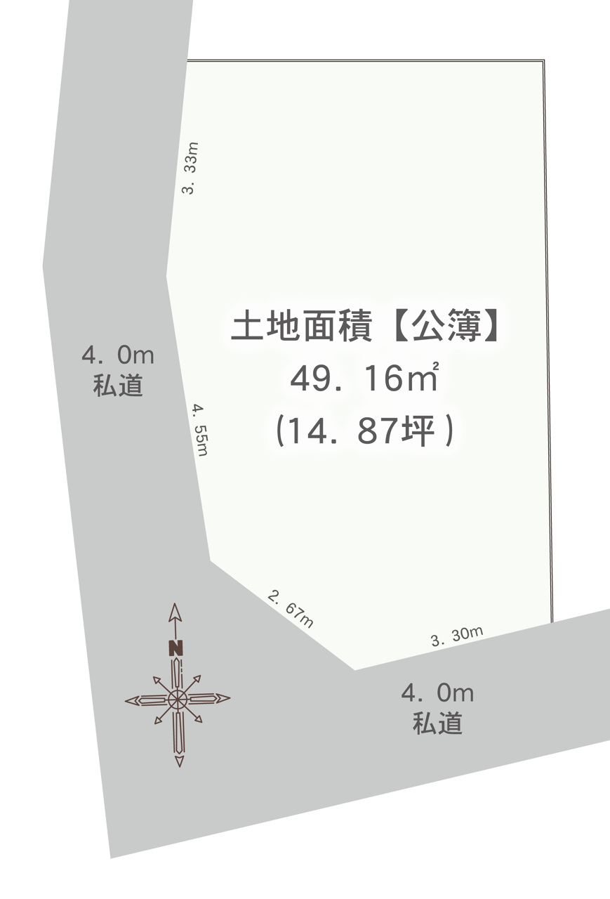 | 土地面積 | 49.16m² 公簿 (私道72.54m²別に有、私道持分比率:1091/7254) | ||