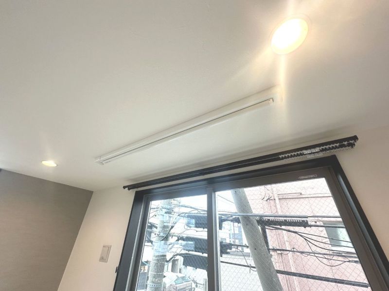 室内物干しを標準装備、エアコンや扇風機を使って、洗濯物まわりの空気を入れ替えてあげることで、自然乾燥よりも早く乾きます。また、早く乾くことで雑菌の繁殖を抑え、生乾きの臭いを減少させることにも繋がります。普段は収納できて見た目もスッキリ。【A号棟 2025年5月撮影】