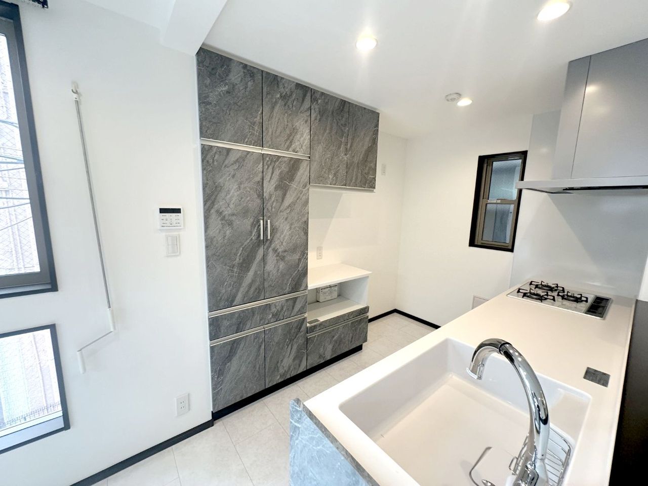 キッチン脇には大容量のカップボードが標準装備。キッチンと合わせたデザインでよりスタイリッシュに。