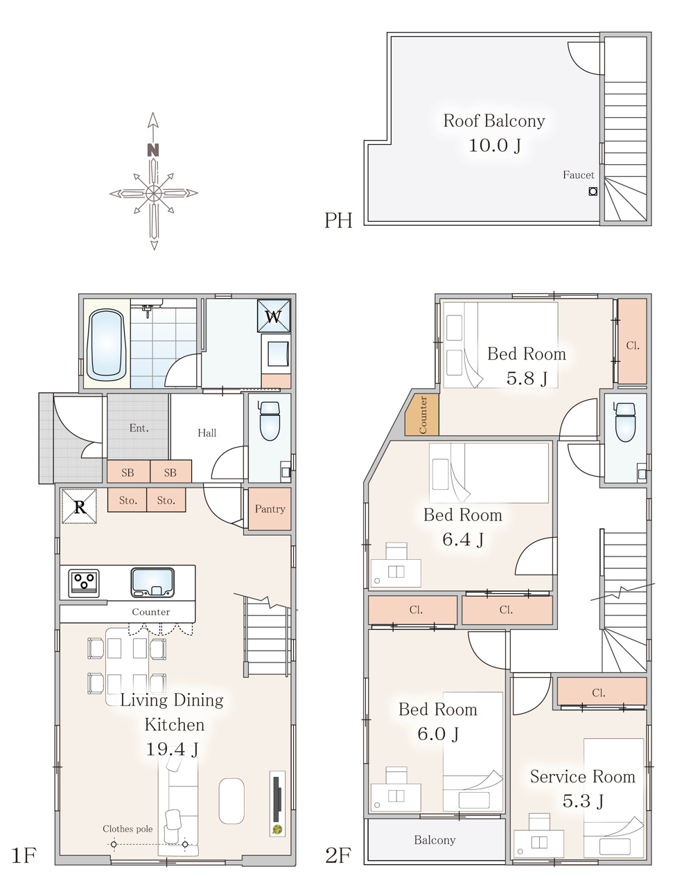 | 間取 | 3SLDK (LDK19.4帖、洋室6.4帖、洋室6.0帖、洋室5.8帖、S5.3帖) | ||