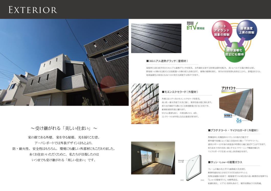 家の顔である外壁、家を守る屋根、光を採りこむ窓。アーバンポートでは外装デザインはもとより、防・耐火性、安全性はもちろん、環境にも優しい外部材にもこだわりました。永くお住まいいただくために、私たちが目指したのはいつまでも受け継がれる「美しい住まい」です。