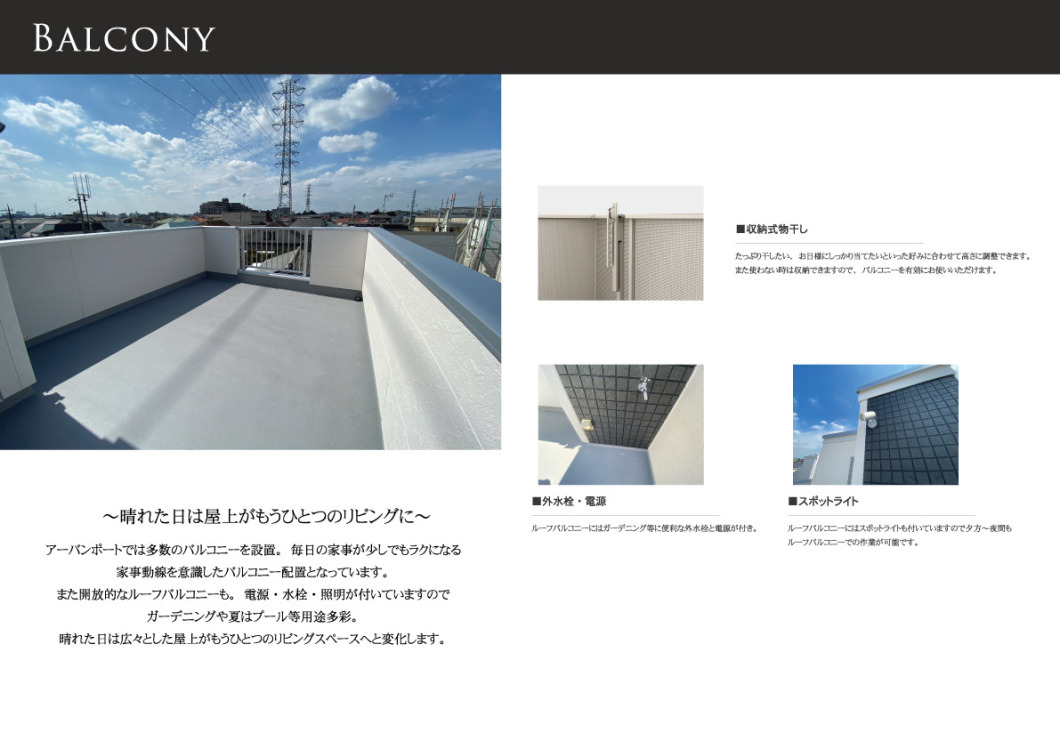 アーバンポートでは多数のバルコニーを設置。毎日の家事が少しでもラクになる家事動線を意識したバルコニー配置となっています。また開放的なルーフバルコニーも。電源・水栓・照明が付いていますのでガーデニングや夏はプール等用途多彩。晴れた日は広々とした屋上がもうひとつのリビングスペースへと変化します。