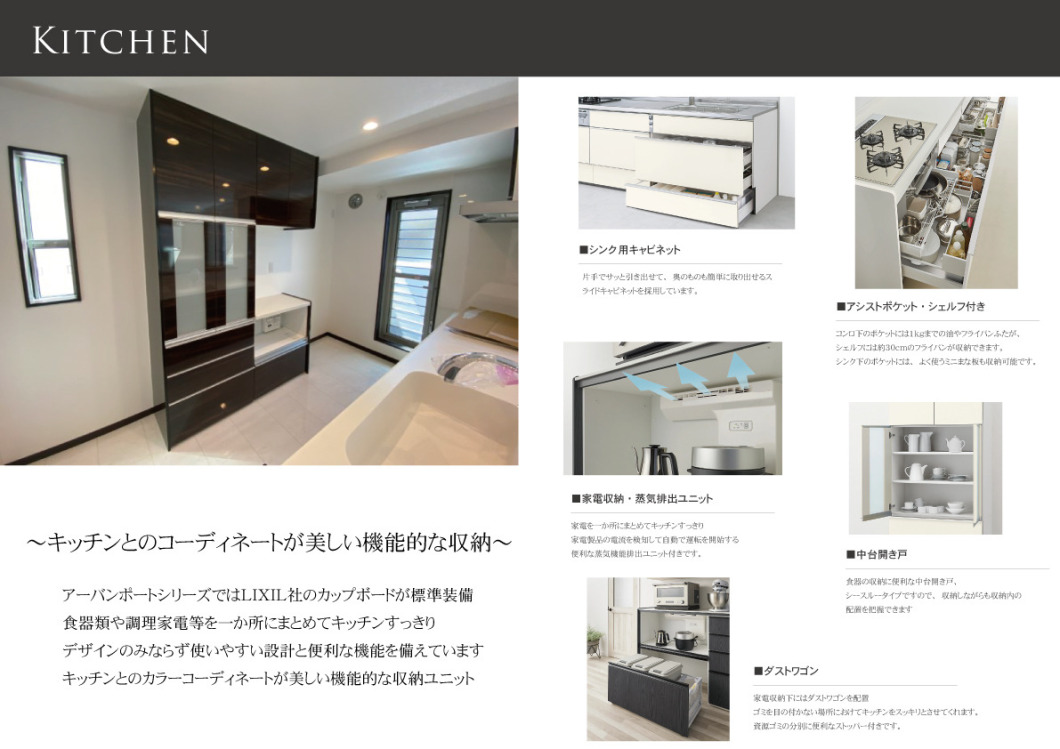 アーバンポートシリーズではLIXIL社のカップボードが標準装備。食器類や調理家電等を一か所にまとめてキッチンすっきり。デザインのみならず使いやすい設計と便利な機能を備えています。キッチンとのカラーコーディネートが美しい機能的な収納ユニット