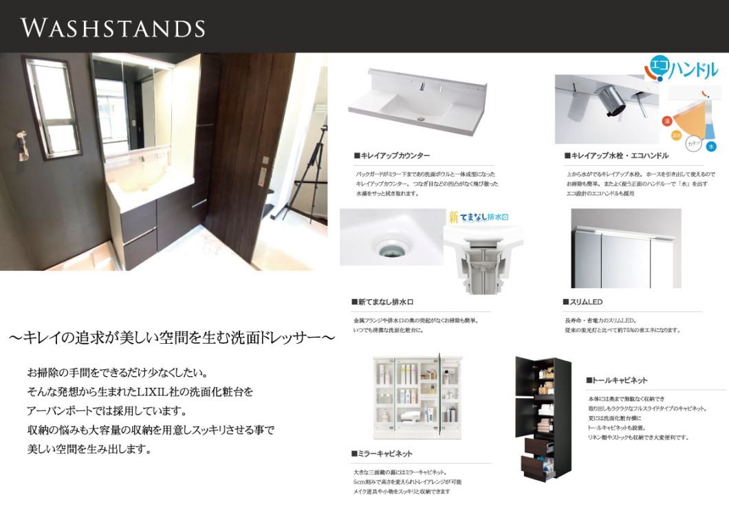 お掃除の手間をできるだけ少なくしたい。そんな発想から生まれたLIXIL社の洗面化粧台をアーバンポートでは採用しています。収納の悩みも大容量の収納を用意しスッキリさせる事で美しい空間を生み出します。