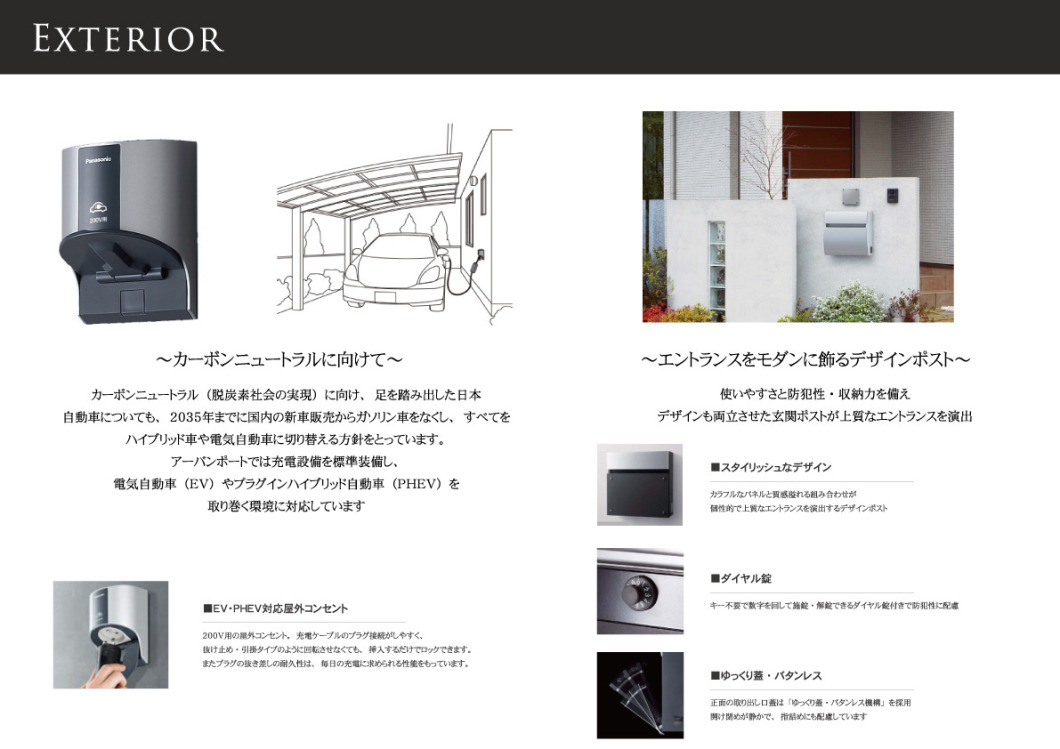 アーバンポートでは充電設備を標準装備し、電気自動車(EV)やプラグインハイブリッド自動車(PHEV)を取り巻く環境に対応。また使いやすさと防犯性・収納力を備えデザインも両立させた玄関ポストが上質なエントランスを演出します。