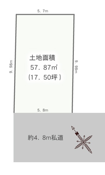 | 土地面積 | 57.87m² 公簿 (私道172.27m²別に有、私道持分比率:1/8) | ||