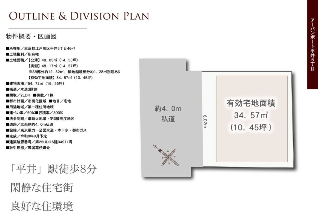 | 土地面積 | 48.17m² 実測 (セットバック12.32m²、【有効宅地面積】34.57平米) |