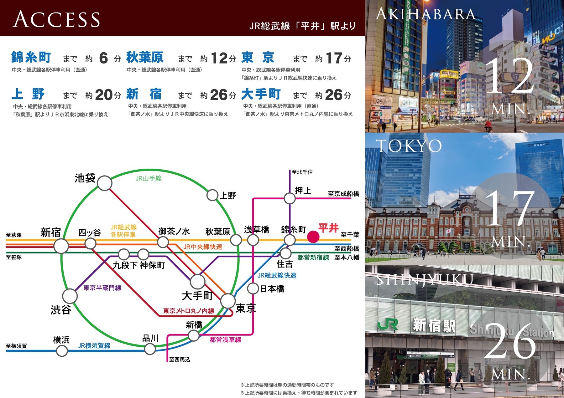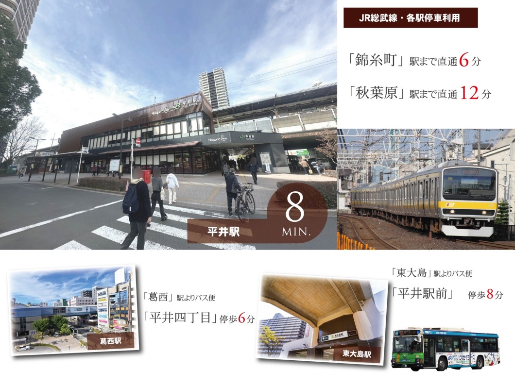 JR総武線「平井」駅徒歩8分、錦糸町・秋葉原・新宿各駅へ乗り換えナシ。都心へ快適アクセスが叶います。