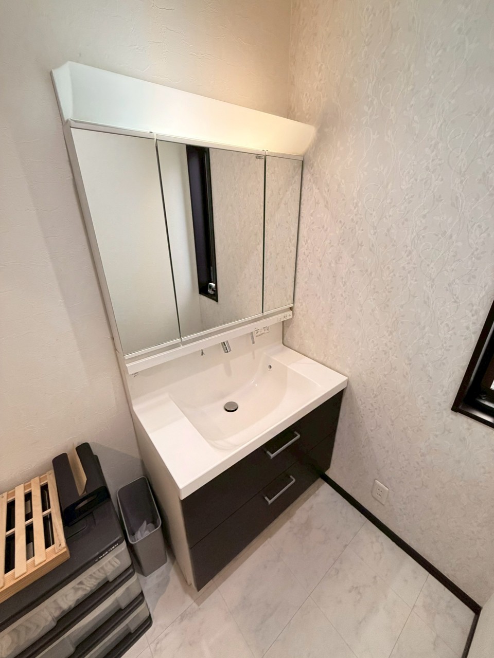 大きな三面鏡、実用性と機能美を兼ね備えた先進の洗面化粧台。ノズルが伸びお手入れもしやすくなっています。リネン類、ストック用品もしまえる豊富な収納量でスッキリ綺麗な空間を保っておけます。