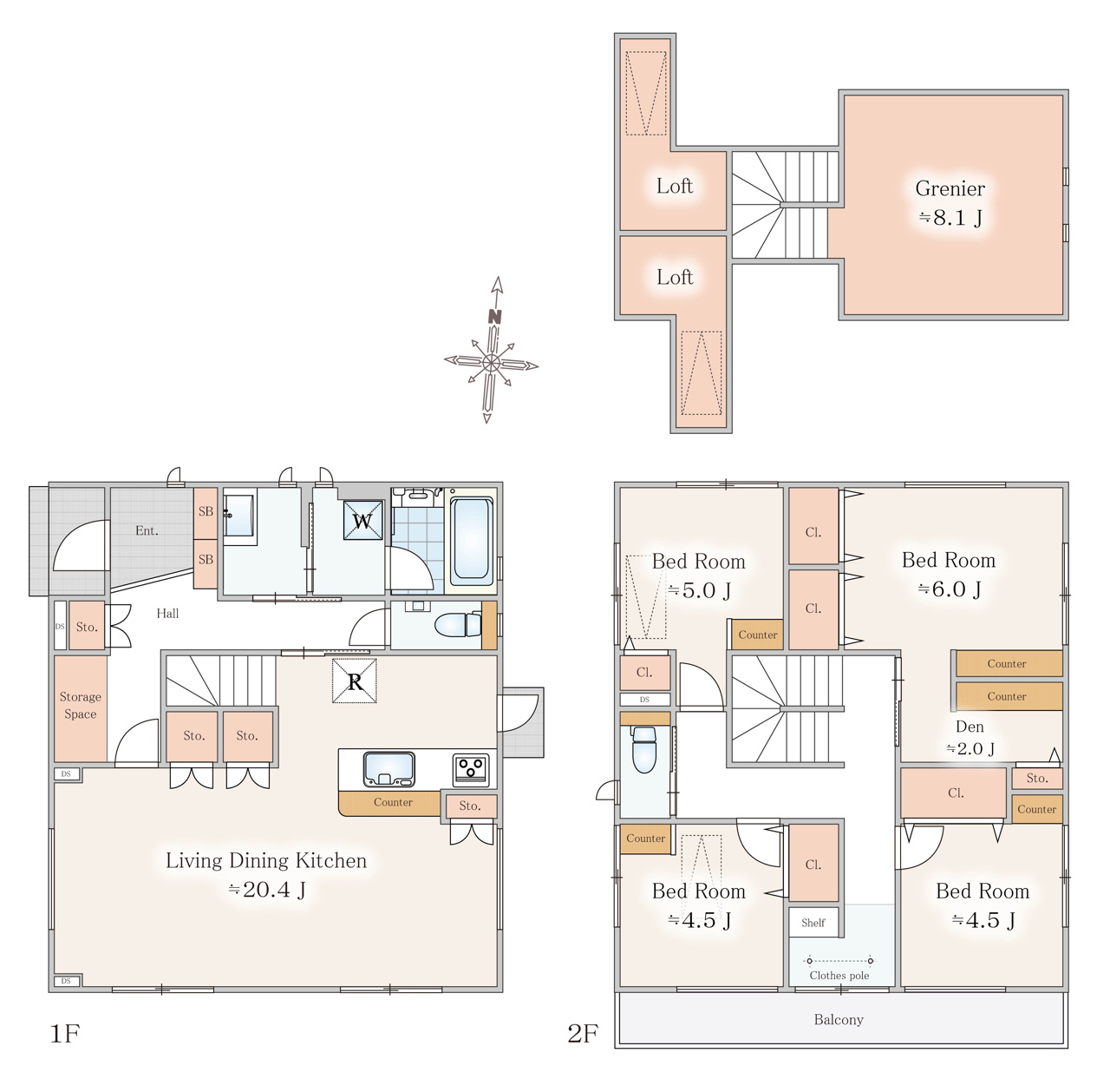 建物面積35坪。LDKは20.4帖、書斎スペースもついた4SLDK、小屋裏収納の他、ロフト2ヶ所付き