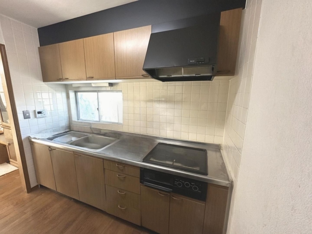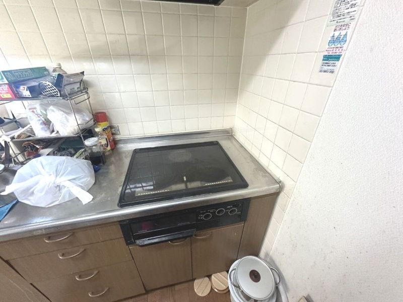 お手入れのしやすいシステムキッチン。収納スペースも豊富。IHクッキングヒーター付きでお料理の幅も広がりますね。※AIによる家具消し実施済