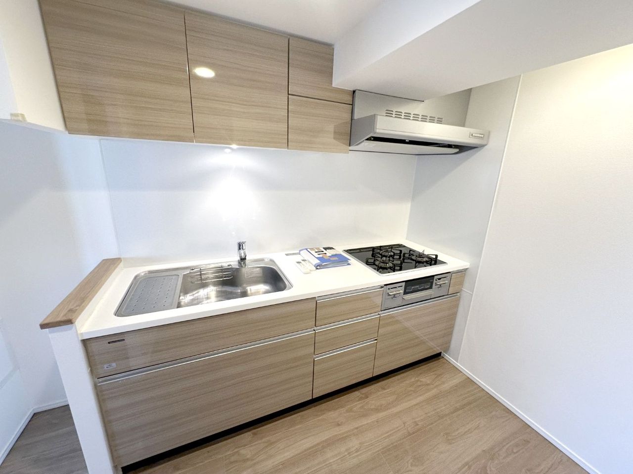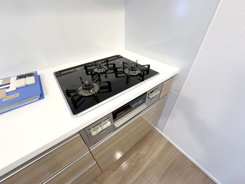 お手入れのしやすい人工大理石トップのシステムキッチン。収納スペースも豊富。3口コンロでお料理の幅も広がりますね。