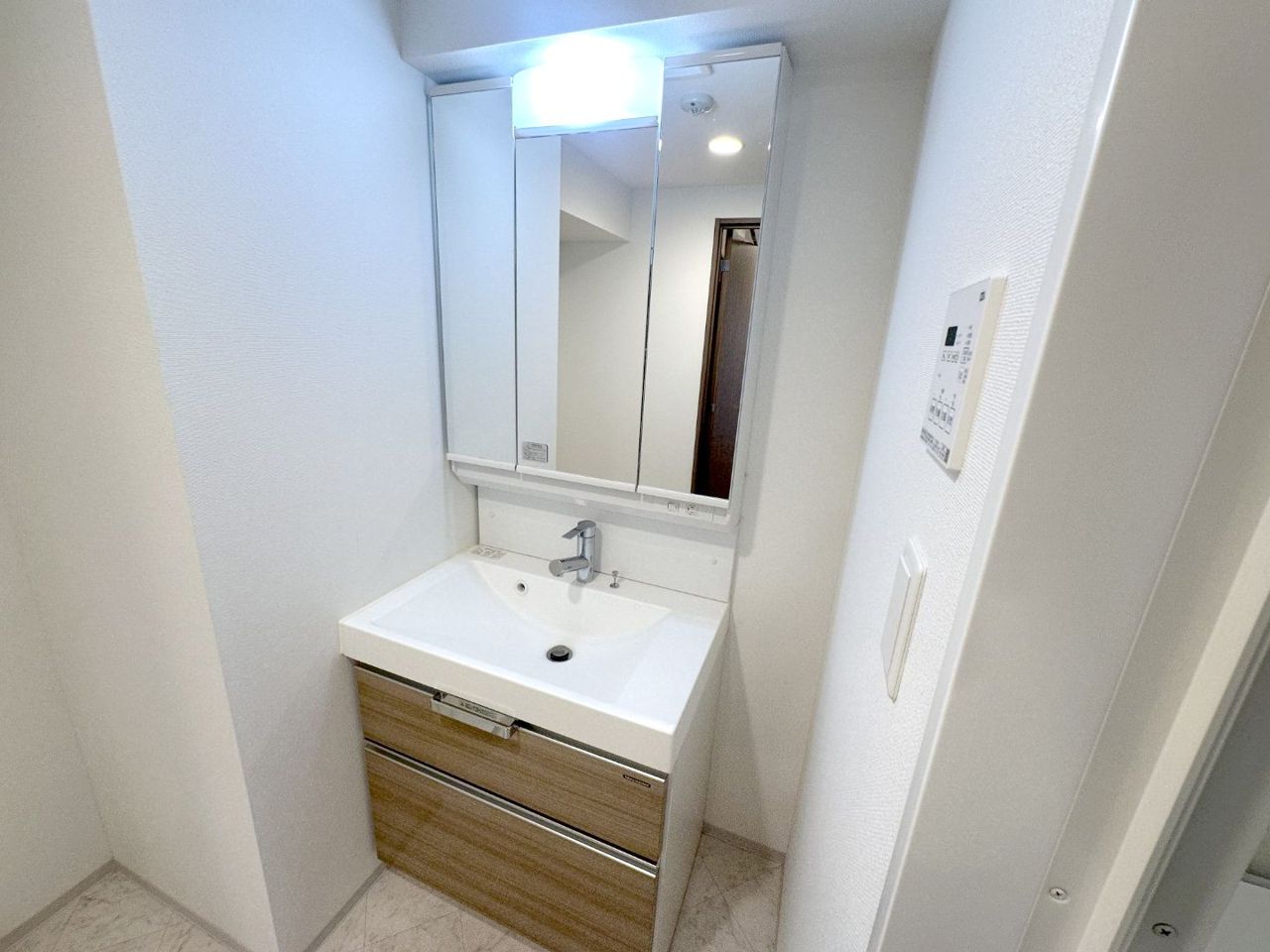 大きな三面鏡、実用性と機能美を兼ね備えた先進の洗面化粧台。ノズルが伸びお手入れもしやすくなっています。リネン類、ストック用品もしまえる豊富な収納量でスッキリ綺麗な空間を保っておけます。