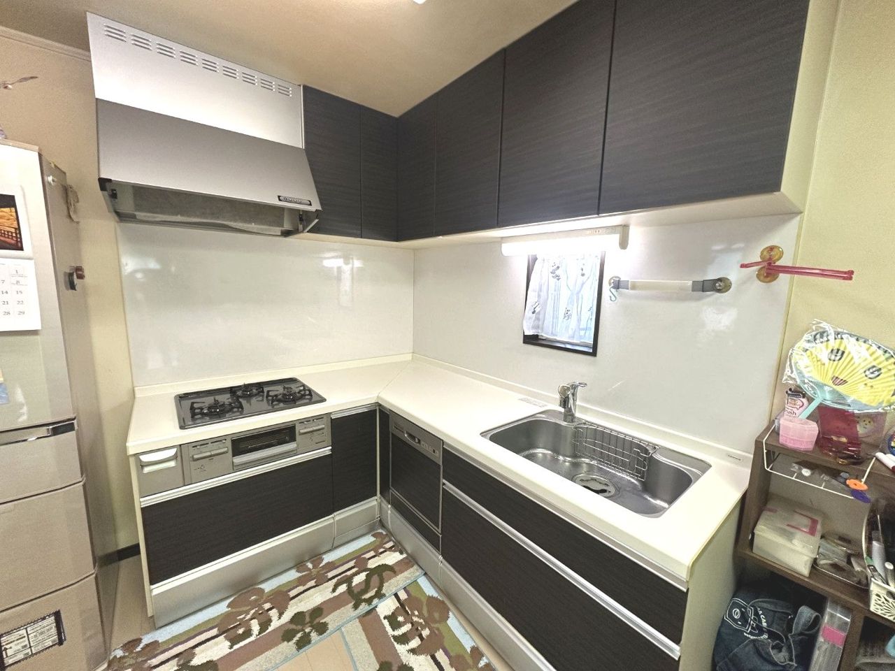 機能性高く使いやすいL字型のシッステムキッチン。収納スペースもしっかりと確保。3口コンロでお料理の幅も広がりますね。