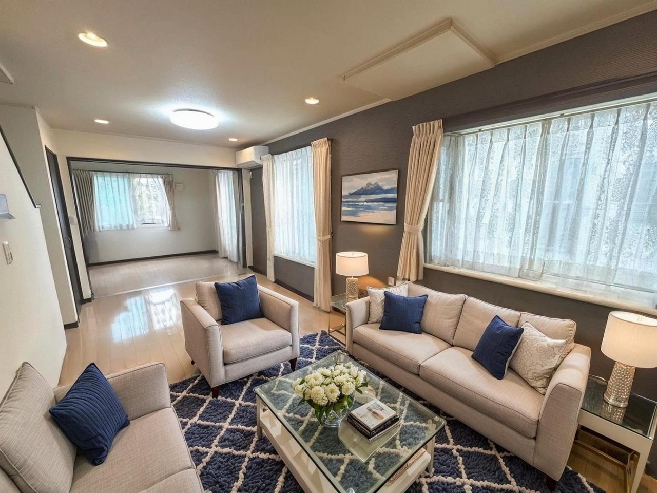 全居室2面採光の明るい室内。光を採り込むために計算された設計となっています。陽当りの良さを是非現地でご体感ください!※AIによる画像生成済み