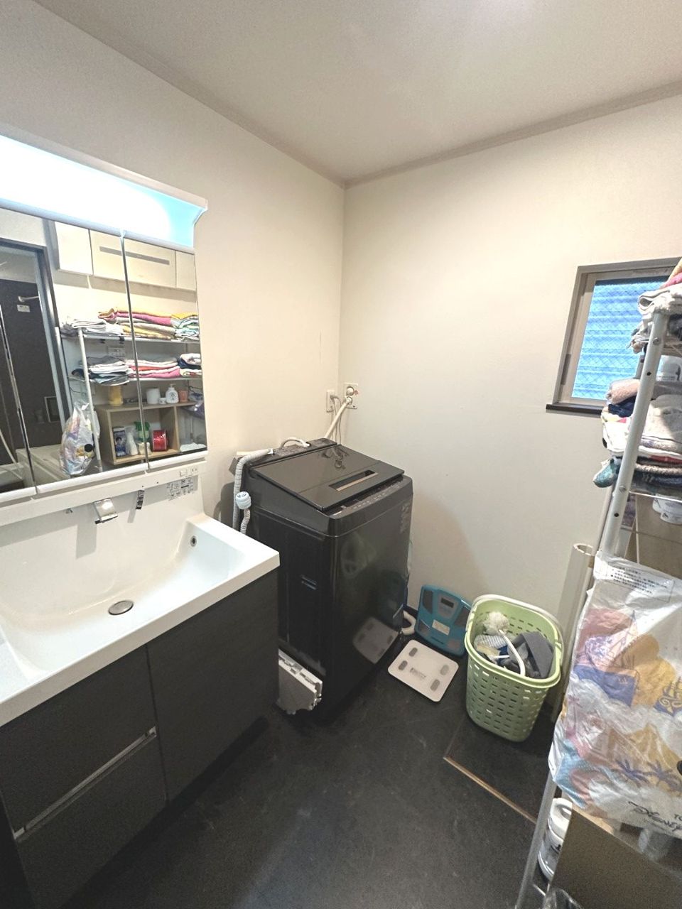 窓付きの明るいパウダールーム。身だしなみのチェック等にも最適。床材も水に傷に強い部材を使用しています。