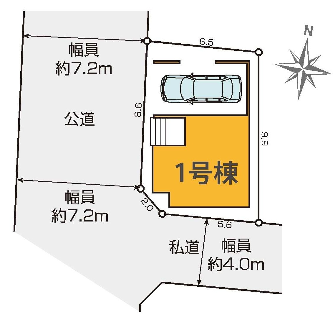 | 接道 | 西側7.2M公道に8.6M接道 南側4M私道に5.6M接道 |