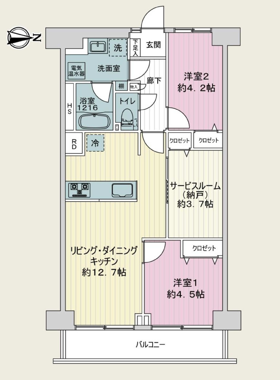 | 間取 | 2SLDK (LDK12.7帖、洋室4.5帖、洋室4.2帖、S3.7帖) | ||