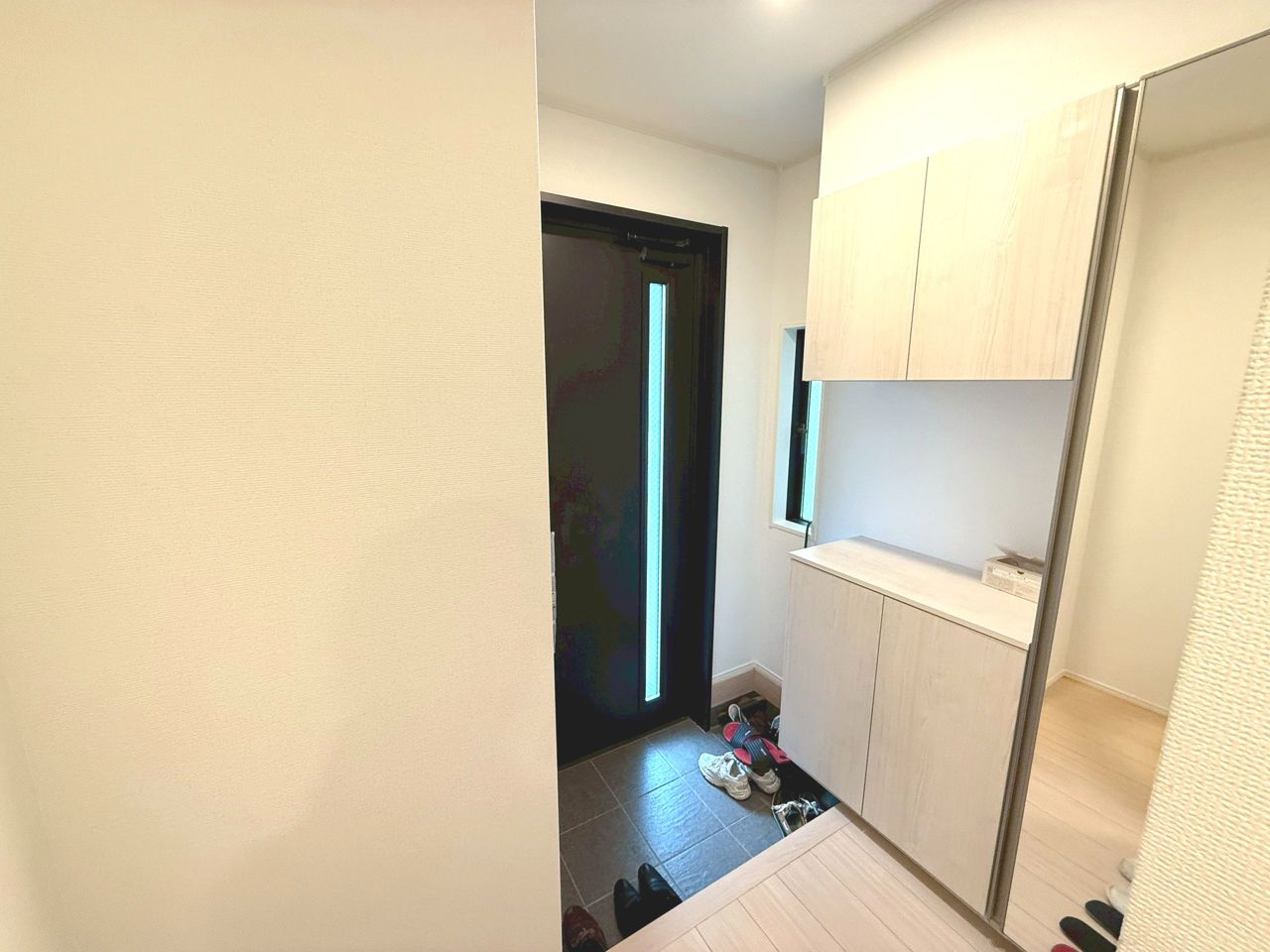 ブーツ等もラクラク収納できるトールタイプの玄関収納。お出かけ前のチェックに便利な姿見付き